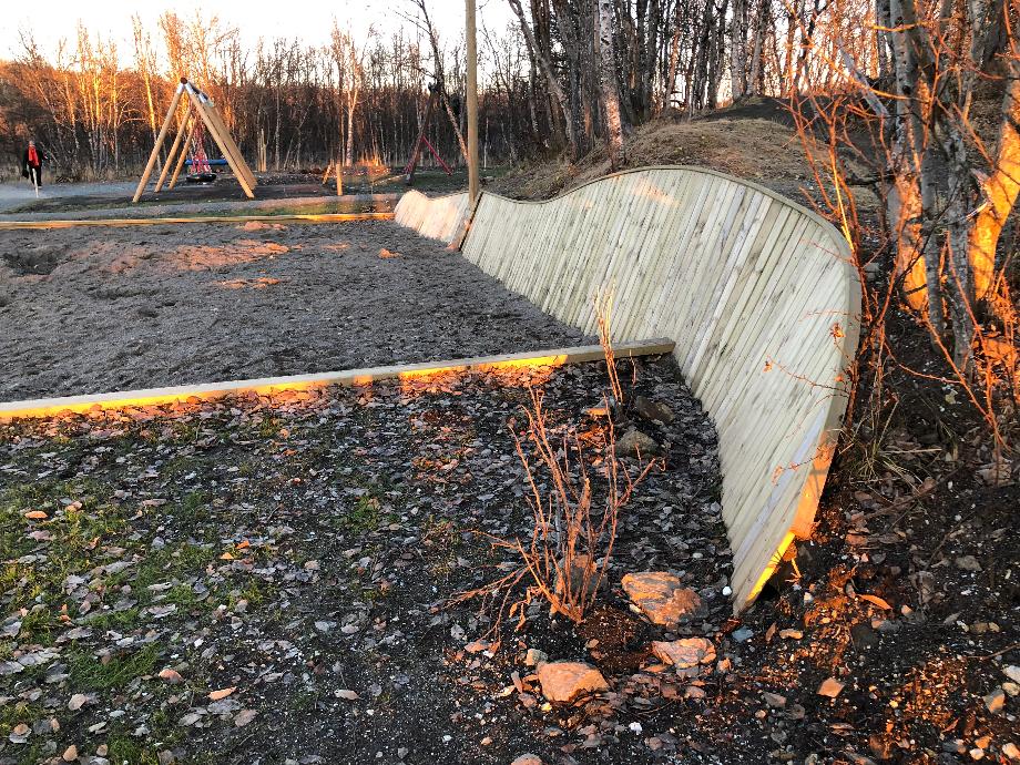Morsom buet og innoverlent støttemur, kledd med tre for å "myke opp"